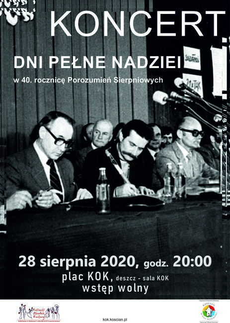 W piątek, 28 sierpnia, w 40. rocznicę Porozumień Sierpniowych Kościański Ośrodek Kultury zaprasza na koncert zatytułowany ,,Dni pełne nadziei’’. Będzie to połączenie muzyki, filmu i słowa. Początek o godz. 20.