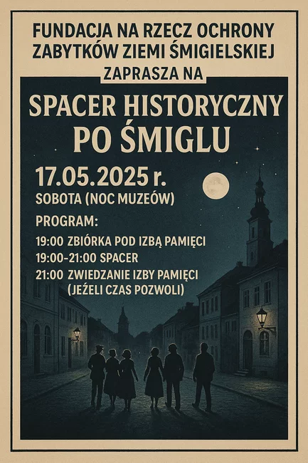 Fundacja na Rzecz Ochrony Zabytków Ziemi Śmigielskiej zaprasza 17 maja na Spacer historyczny po Śmiglu. Spacer rozpocznie się o godzinie 19. i potrwa do godziny 21. Zakończy go zwiedzanie Izby Pamięci Ziemi Śmigielskiej.