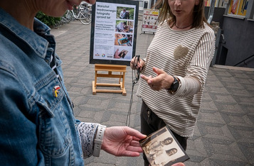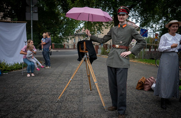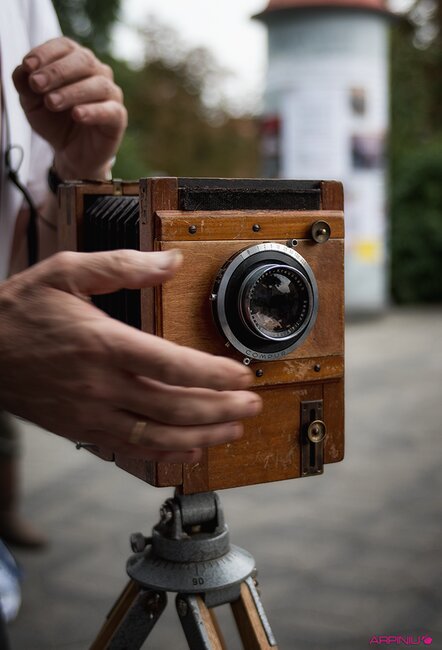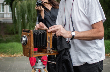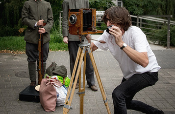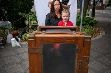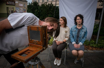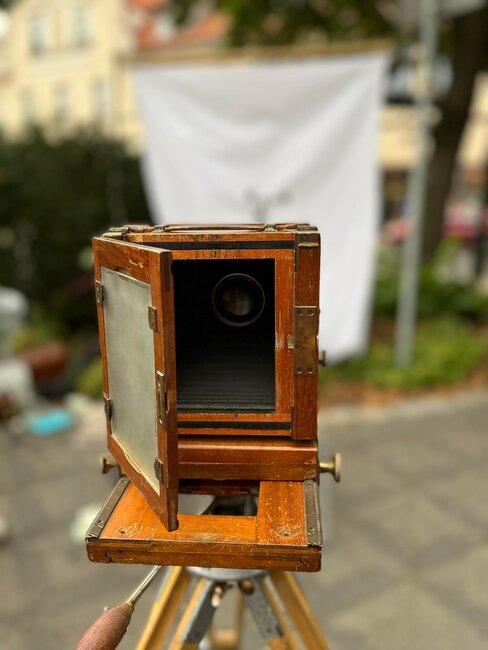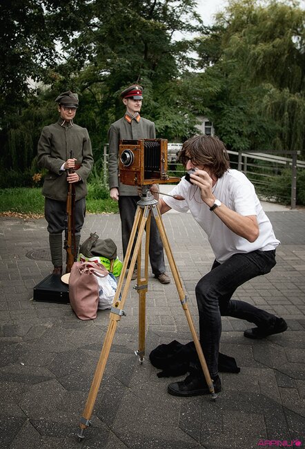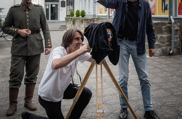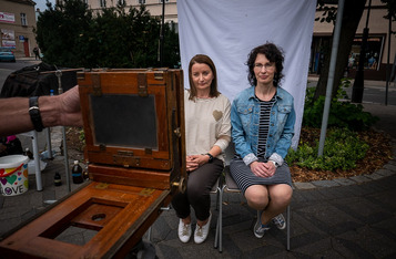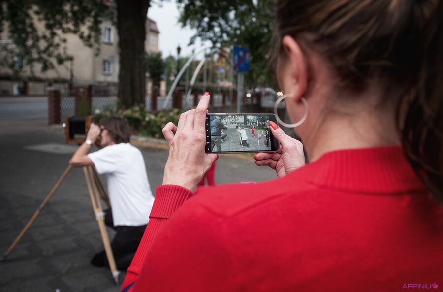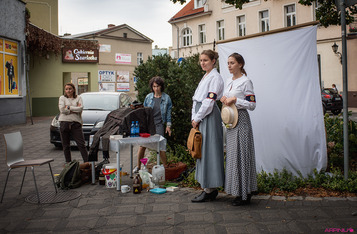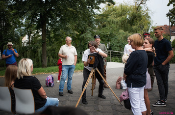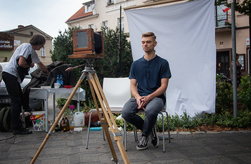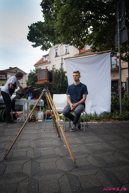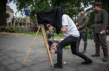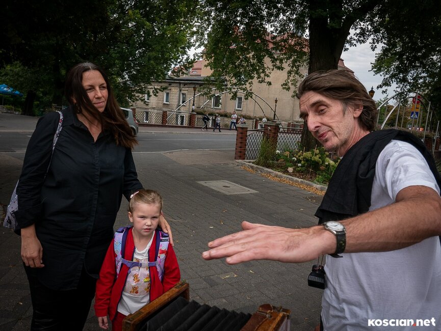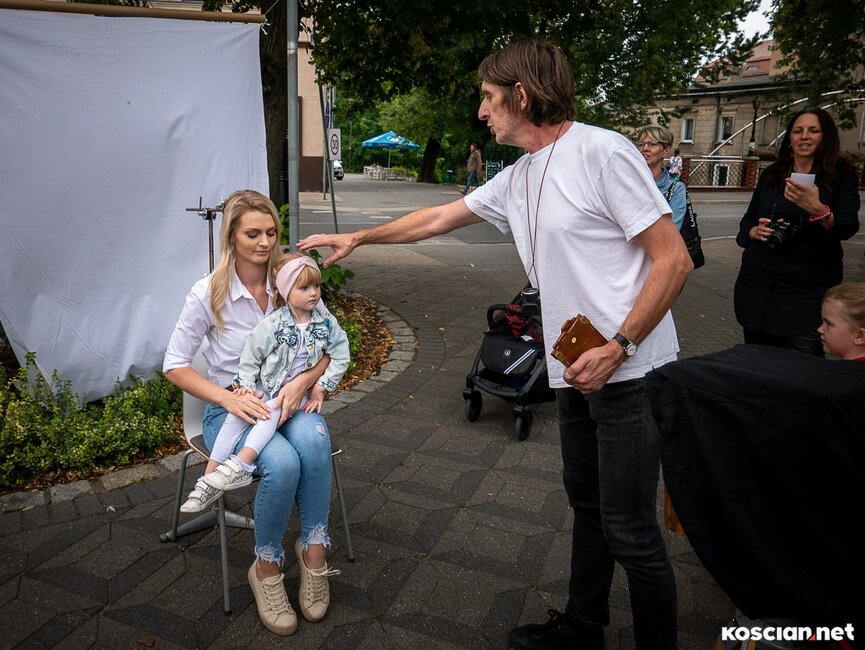 Nie brakowało chętnych do pozowania wędrownemu fotografowi, który rozstawił swój warsztat przed kościańską biblioteką.