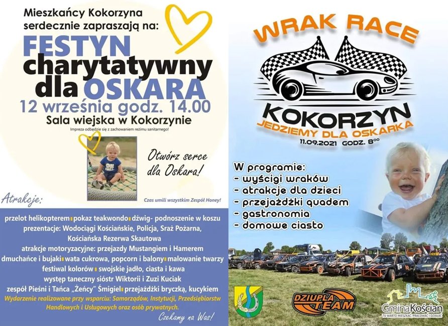 Przed nami dwie imprezy charytatywne dla dziewiętnastomiesięcznego Oskara z Kokorzyna: w sobotę Wrak Race, w niedzielę festyn.