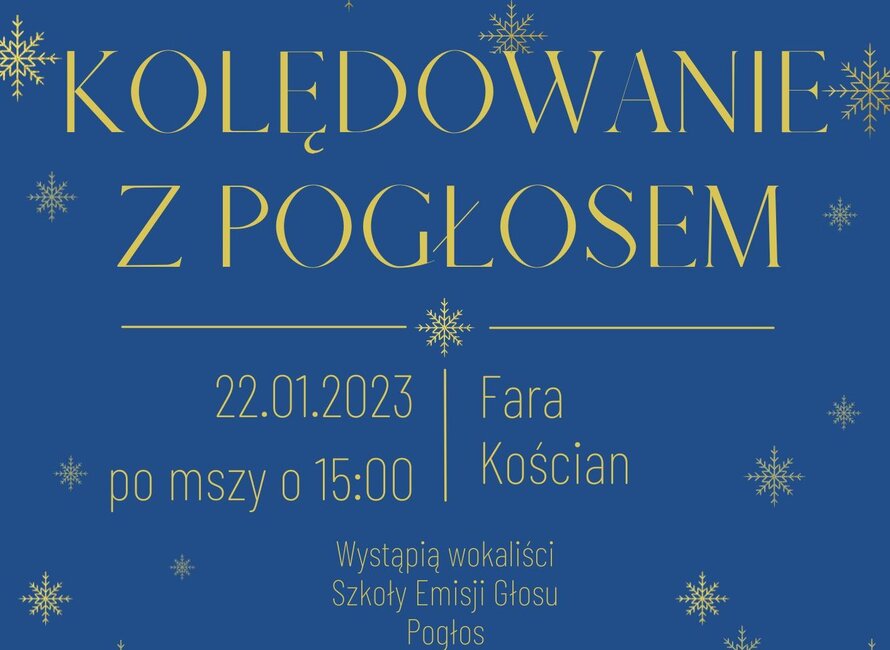 Dzień później, 22 stycznia, w kościańskiej farze odbędzie się koncert uczniów Szkoły Emisji Głosu PoGłos pod tytułem „Kolędowanie z Pogłosem”. Podczas wydarzenia wstąpi 10 młodych adeptek sztuki wokalnej, które szkolą się pod okiem Emilii Ziegler-Opary oraz Jakuba Szpunta. Koncert odbędzie się po mszy świętej o 15:00.