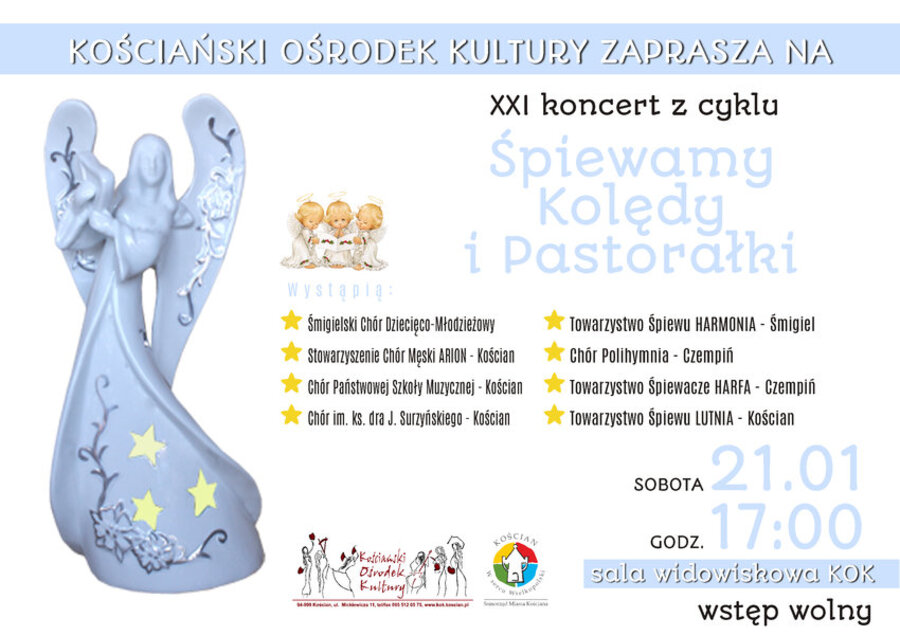 W najbliższą sobotę, 21 stycznia, Kościański Ośrodek Kultury zaprasza na XXI edycję koncertu „Śpiewamy Kolędy i Pastorałki”. Początek o godzinie 17.00. Wstęp wolny.