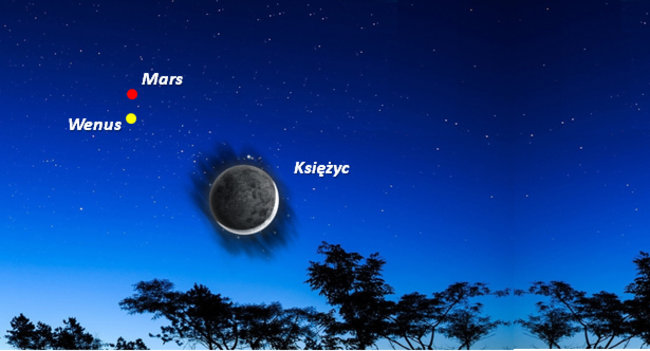 W piątek po zachodzie słońca można było obserwować na niebie spotkanie Księżyca, Wenus i Marsa. Rzadko można zobaczyć Wenus i Mars tak blisko siebie.