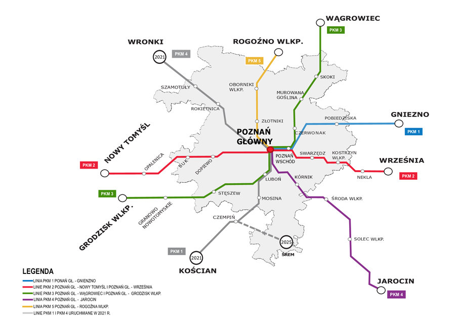 Poznańska Kolej Metropolitalna to jedno z największych tego typu przedsięwzięć w Polsce. Jej celem jest zwiększenie integracji powiatów i gmin w promieniu około 50 km od Poznania. Pierwsze pięć linii połączyło z Poznaniem Grodzisk Wielkopolski, Jarocin, Nowy Tomyśl, Wągrowiec i Swarzędz. W 2021 roku aktywowane będą połączenia z Gniezna, Kościana, Rogoźna, Wronek i Wrześni. Kursy PKM w godzinach szczytu odbywają się nawet co 30 minut.