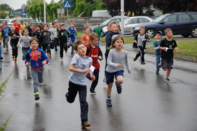 śmiech i żenada klasy 1-3 biegną razem który pierwszak wygra z trzecim gratuluje pomysłu dyrekcji Bieg Stammowski odbębniony.