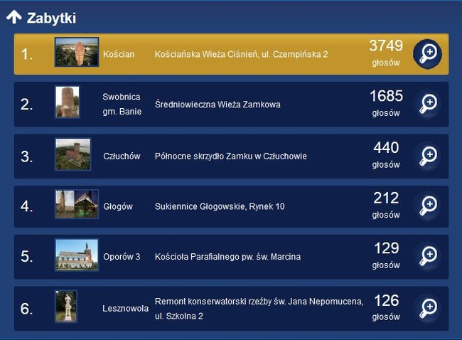 Konkursowi towarzyszy internetowy plebiscyt. Za najlepszą modernizację roku 2013 wśród zabytków internauci uznali rewitalizację kościańskiej wieży ciśnień. Oddano na nią 3749 głosów, to jest aż ponad 2000 głosów więcej niż na zajmującą drugie miejsce średniowieczna wieżę zamkową w Swobnicy.
