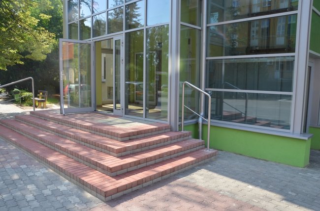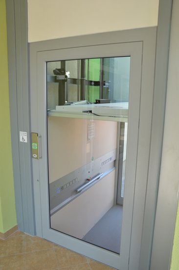 Trzypoziomowa winda o konstrukcji stalowej, zlokalizowana jest przy wejściu do budynku. Front budynku, taras na piętrze oraz parter zostały zabudowane. Winda ułatwi transport chorych na wózkach i łóżkach.