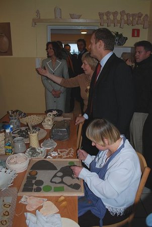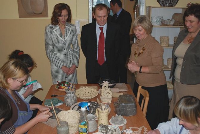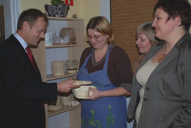 W rolę przewodnika po Warsztatach wcieliła się kierownik Anna Hryniewicz-Szulc i senator Małgorzata Adamczak, która jest jednocześnie szefową Stowarzyszenia Światło Nadziei. Zwiedzanie premier Tusk rozpoczął od pracowni ceramicznej, gdzie usłyszał szczegółowy opis procesu przygotowania glinianych cacek - od formowania przez suszenie, wypalanie, szkliwienie aż po zdobienie. Z zachwytem przyglądał się gotowym wyrobom. Podziwiał misy, wazony, filiżanki, dzbanki, doniczki, aniołki, wiszące ozdoby świąteczne, zawieszki i korale. Przepiękny ceramiczny naszyjnik przekazała w darze premierowi Kamila.