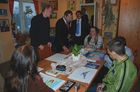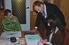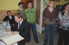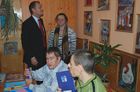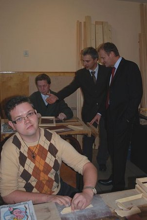 W pracowni komputerowej premier zapoznał się z projektami kartek okolicznościowych, wizytówek, zaproszeń, kalendarzy, dyplomów, listów gratulacyjnych. Otrzymał też najnowszy numer kwartalnika ,,Jesteśmy Wśród Was’’ i obejrzał stronę internetową Warsztatów.