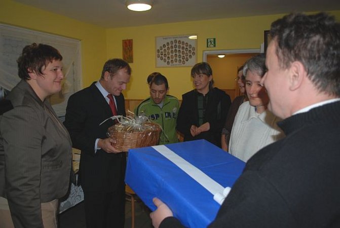 W prezencie premier otrzymał kosz pełen niespodzianek, w którym znajdowała się m.in. szopka bożonarodzeniowa, świąteczne ozdoby i ceramiczna zawieszka z napisem ,,Dom pod dobrym aniołem’’. W rewanżu premier podarował kościańskim Warsztatom DVD. Podpisał też piłkę i wpisał się do księgi pamiątkowej. Była też chwila na zrobienie sobie wspólnego zdjęcia z niezwykłym gościem. Warsztatowicze z pewnością na długo zapamiętają tę wizytę i ze szczegółami opiszą w kolejnym numerze swojej gazety.