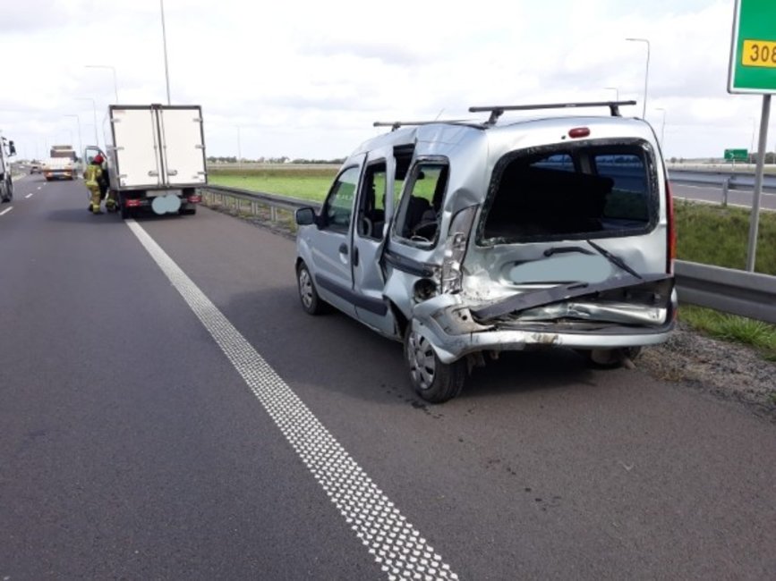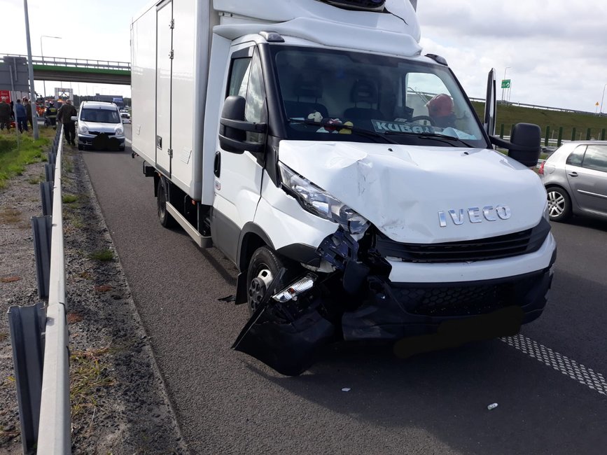 Kierujący renault kangoo zaczął hamować gdy zauważył, że zablokowany jest pas do zjazdu z drogi ekspresowej. Kierowca jadącego za osobówką busa nie zareagował w porę i uderzył w tył renaulta.