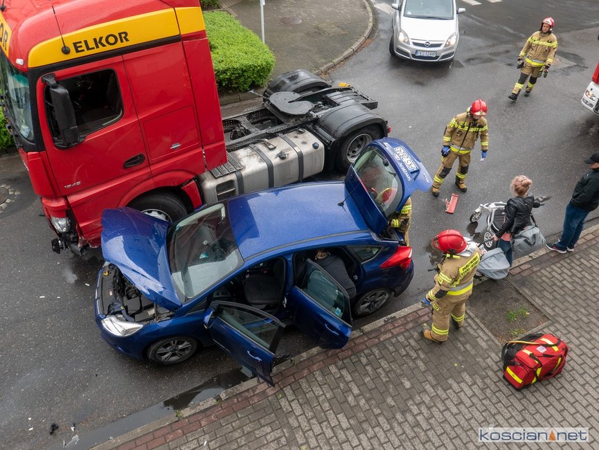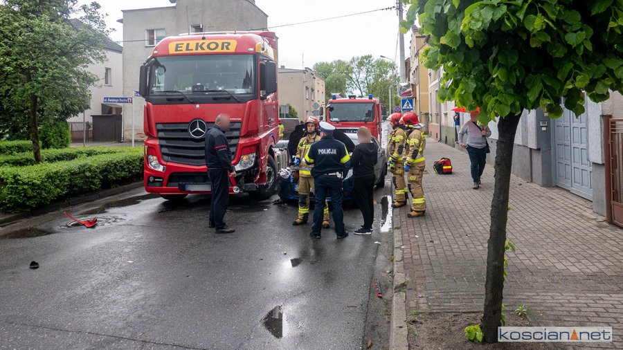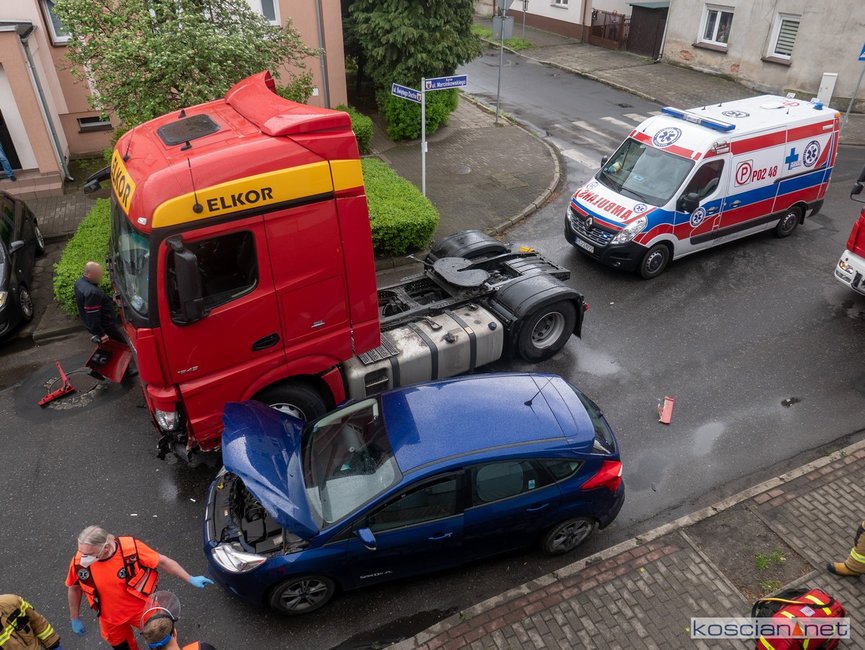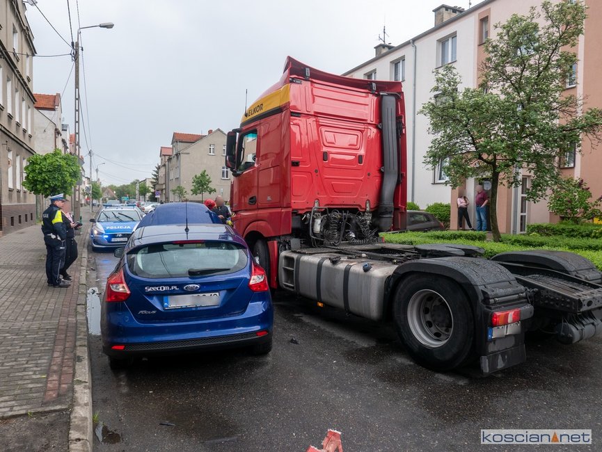 Do kolizji doszło we wtorek, 18 maja, około godziny 14.30 na skrzyżowaniu ulic Świętego Ducha i Marcinkowskiego w Kościanie. W jadącego ulicą Marcinkowskiego w kierunku ulicy Grodziskiej forda focusa uderzył wyjeżdżający z podporządkowanej ulicy Świętego Ducha ciągnik siodłowy na gdańskiej rejestracji. Samochodem osobowym podróżowała kobieta z małym dzieckiem. Na szczęście nikt nie odniósł obrażeń. Przez kilkadziesiąt minut ulica Marcinkowskiego była nieprzejezdna.