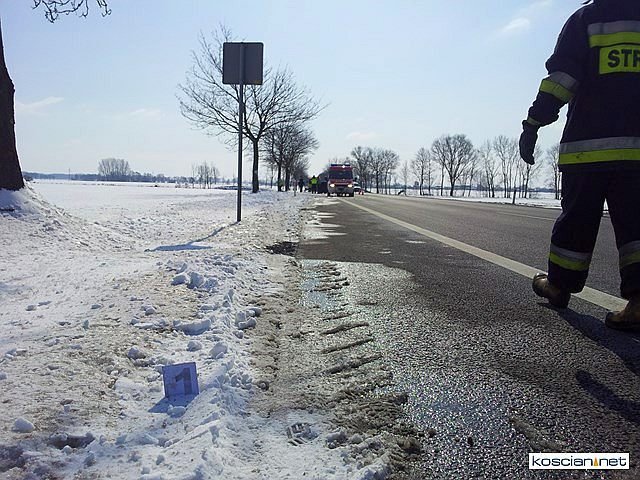 W niedzielę, 24 marca, około godziny 11.35 na drodze krajowej nr 5 w okolicy wsi Kawczyn kierujący volswagenem golfem 23-letni mieszkaniec Kościana stracił panowanie nad pojazdem i zjechał na przeciwległy pas ruchu po czym uderzył w przydrożne drzewo.