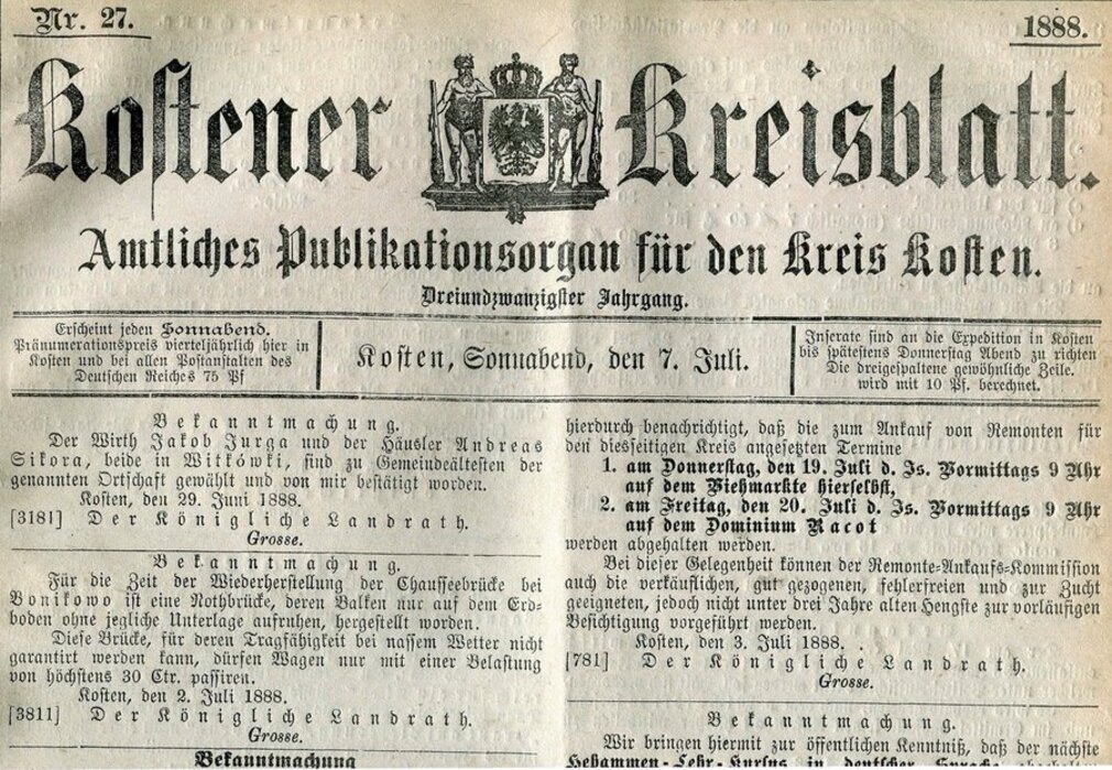 „Kostener Kreisblatt ”, nr 17, 28 IV 1888 r.