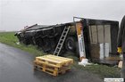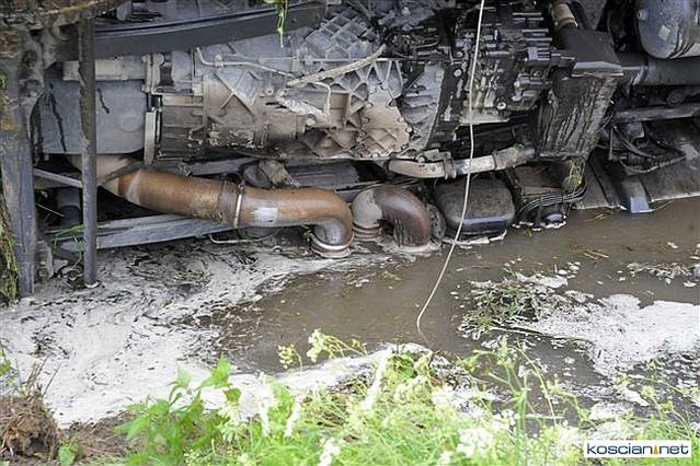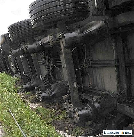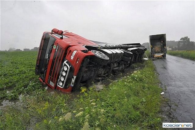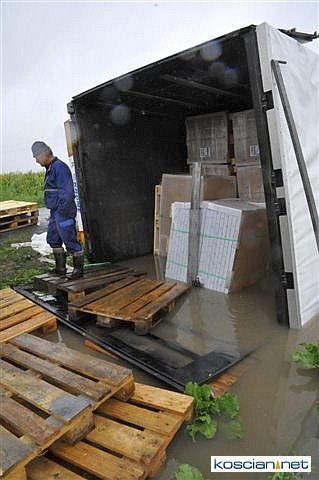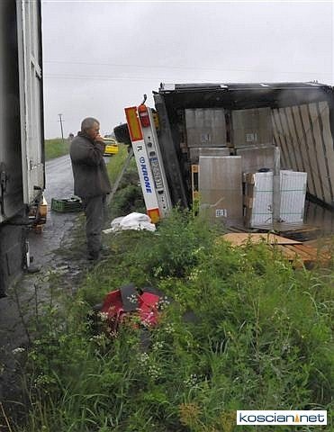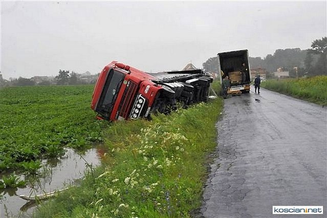 Na drodze z Kokorzyna do Szczodrowa ciężarówka przewożąca meble „złapała pobocze” podczas mijania się z innym pojazdem, wpadła do rowu i przewróciła się kończąc jazdę na podtopionym polu