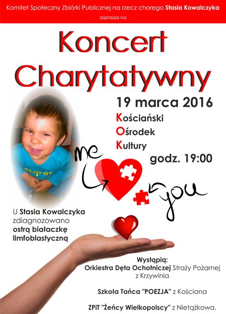 W sobotę w KOK wystąpią: Zespół Pieśni i Tańca „Żeńcy Wielkopolscy” z Nietążkowa, Orkiestra Dęta OSP Krzywiń, Szkoła Tańca Poezja. Biletem wstępu na koncert, który rozpocznie się o godz. 19, będą cegiełki. Dochód z imprezy za pośrednictwem śmigielskiego Stowarzyszenia Światło Nadziei zostanie przekazany rodzicom maluszka.