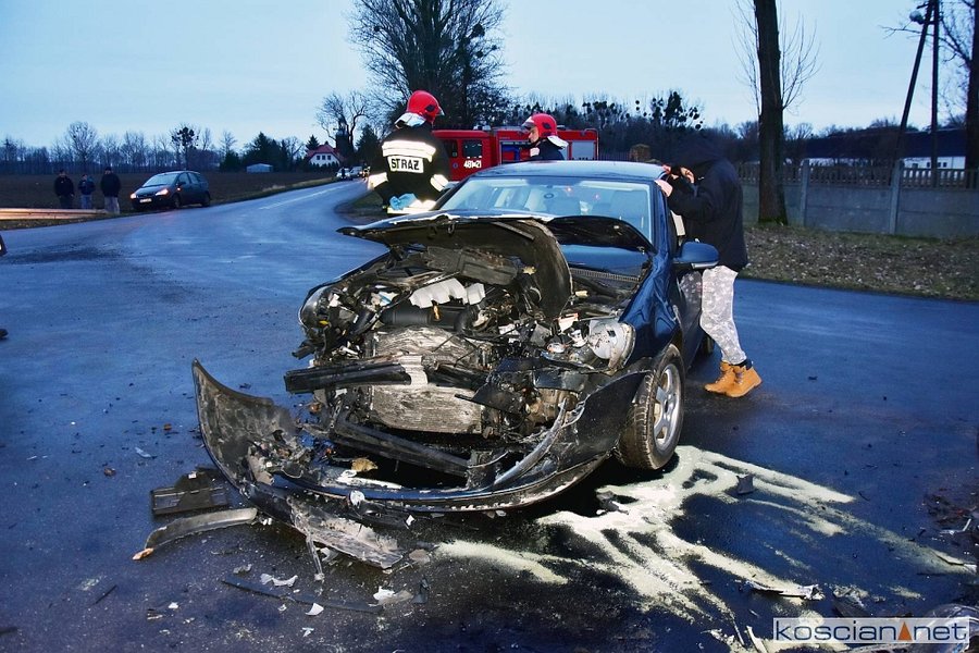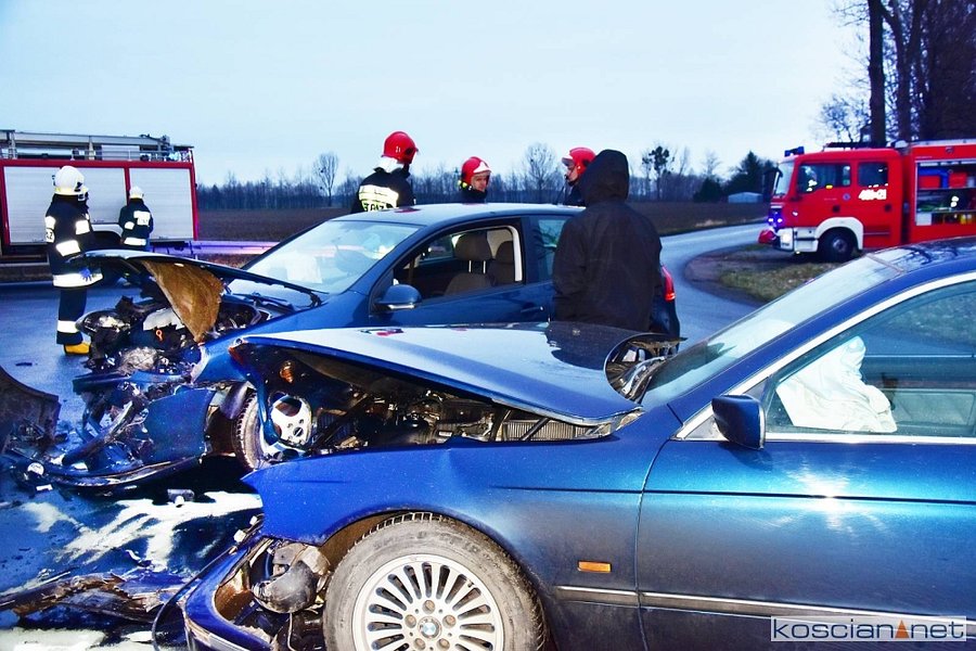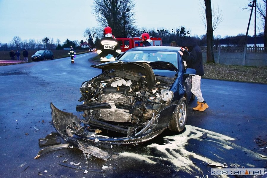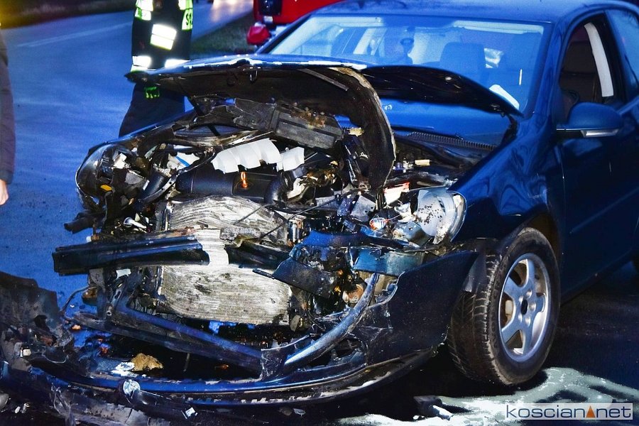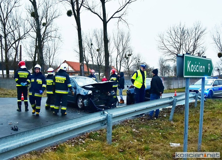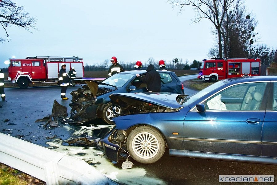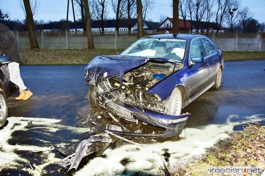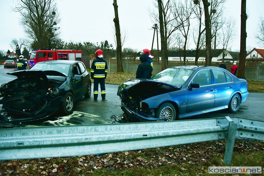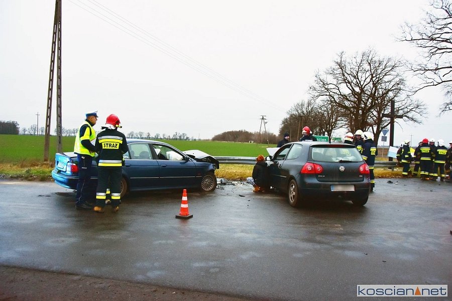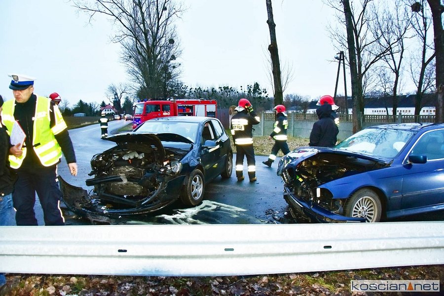 Do kolizji doszło w środę, 8 stycznia, około godziny 15.20 w Starym Gołębinie. Kierujący samochodem marki BMW, 32-letni mieszkaniec powiatu śremskiego, na łuku drogi zjechał na przeciwny pas ruchu doprowadzając do czołowego zderzenia z volkswagenem golfem kierowanym przez 60-latka z powiatu kościańskiego. Kierowcę golfa przewieziono do szpitala na badania. Przyczyną kolizji było niedostosowanie przez kierowcę bmw prędkości do warunków panujących na drodze.