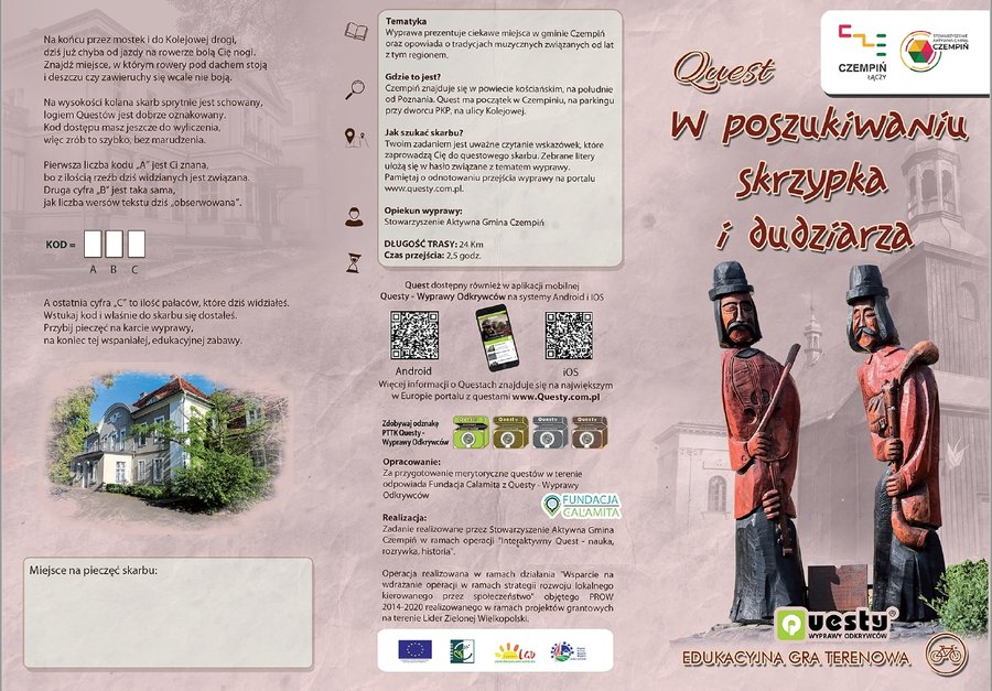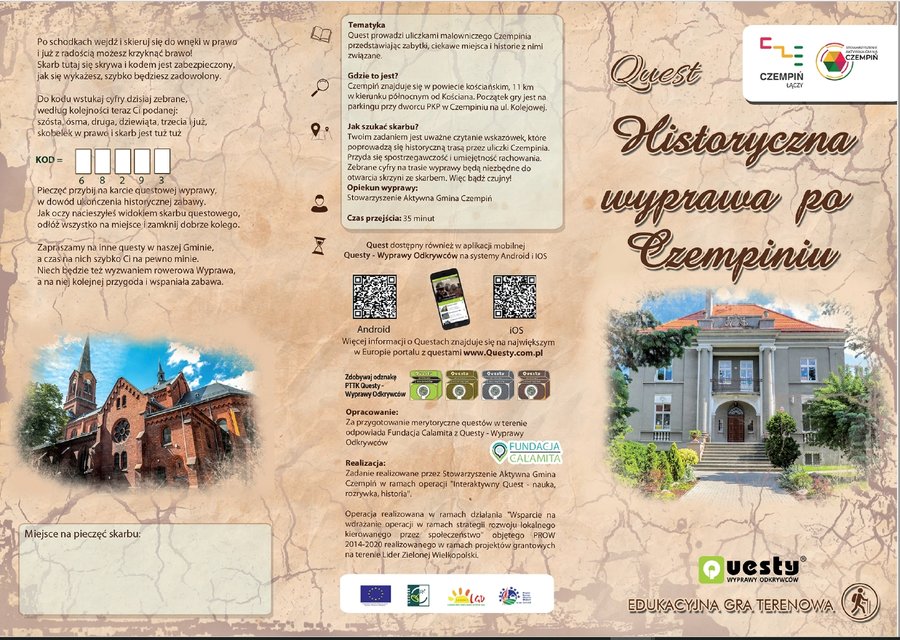 Zadanie realizowane jest przez Stowarzyszenie Aktywna Gmina Czempiń ze środków Programu Rozwoju Obszarów Wiejskich na lata 2014 – 2020 przyznanych przez Lokalną Grupę Działania Lider Zielonej Wielkopolski. Za merytoryczne przygotowanie questów odpowiada Fundacja Calamita z Questy – Wyprawy Odkrywców.