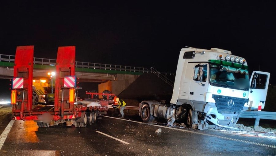 Ciągnik siodłowy uderzył w bariery energochłonne i zablokował pas w kierunku Poznania.