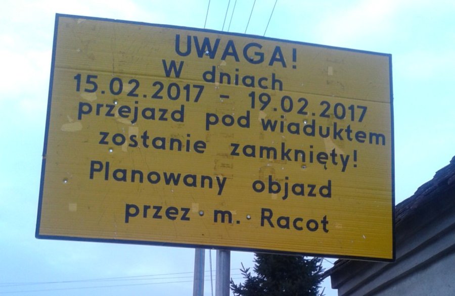 Jak informuje firma „Torpol” – generalny wykonawca modernizacji linii kolejowej na odcinku Czempiń – Leszno - przejazd pod wiaduktem w Nacławiu będzie zamknięty od 15 do 19 lutego br. Nie należy się zatem sugerować ustawioną przy drodze tablicą z informacją, że droga zostanie zamknięta... w zeszłym roku.