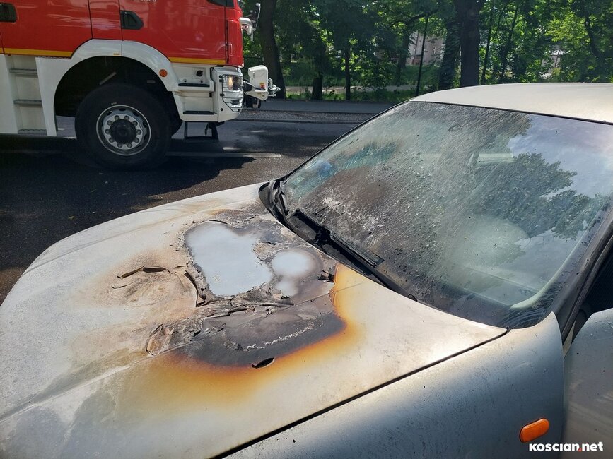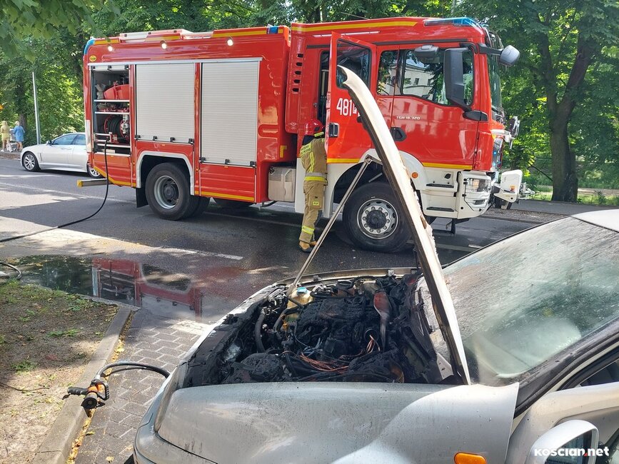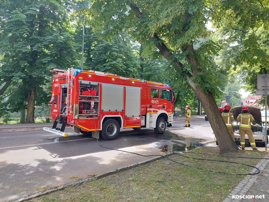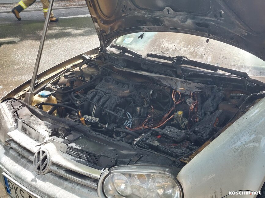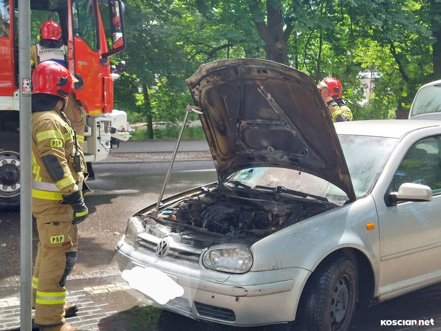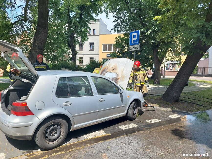 Strażacy gasili zaparkowanego na Placu Wolności w Kościanie volkswagena golfa.