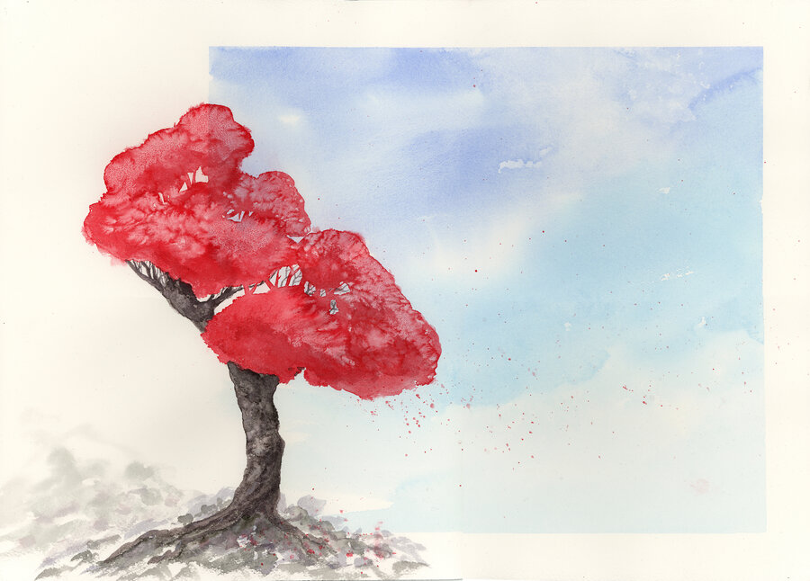Przedmiotem aukcji na Allegro Lokalnie jest akwarela - Drzewo z czerwonymi liśćmi. Cena wywoławcza 1 zł.
