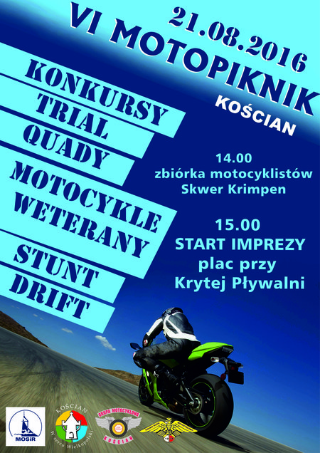 Organizatorzy zapraszają dziś w godzinach 15.00 – 19.30 na VI MOTOPIKNIK, który odbędzie się na parkingu krytej pływalni przy ul. Nacławskiej w Kościanie. Jak co roku na fanów motoryzacji czeka moc atrakcji.