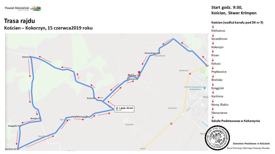 Rowerzyści wyruszą spod kościańskiego wiatraka na Skwerze Krimpen. Pojadą wzdłuż kanału pod drogą nr 5, dalej przez Kiełczewo, Szczodrowo, Kokorzyn, Krzan, Kotusz, Pętkowice, Brońsko, Księginki, Karśnice, Nowy Białcz, Skoraczewo, by wrócić do Kokorzyna. Meta rajdu znajdować się będzie przy Szkole Podstawowej w Kokorzynie. Długość trasy to ok. 28 km.