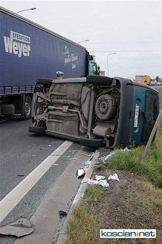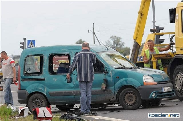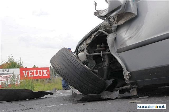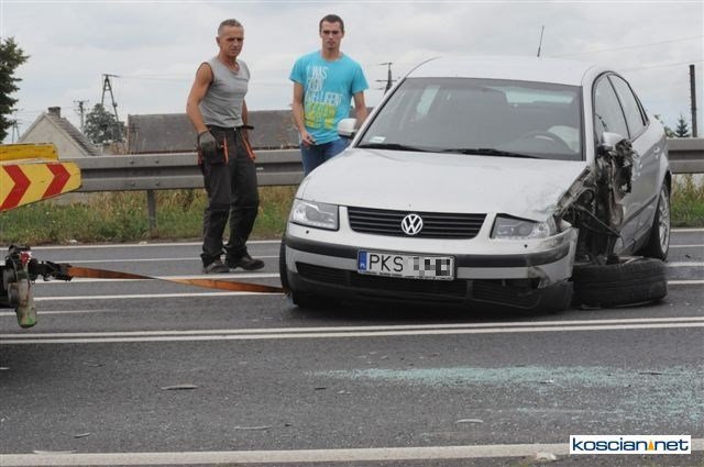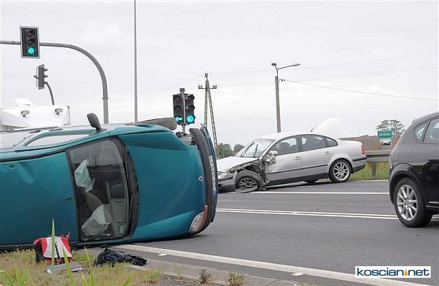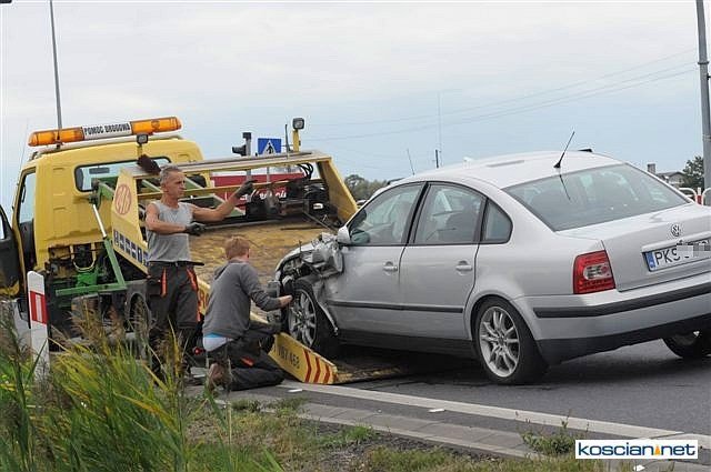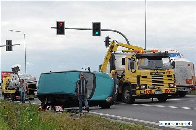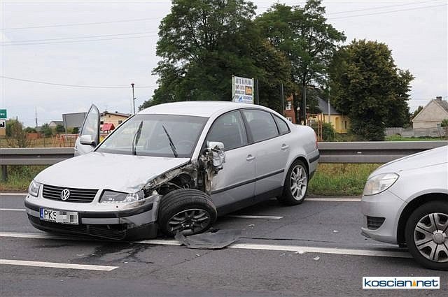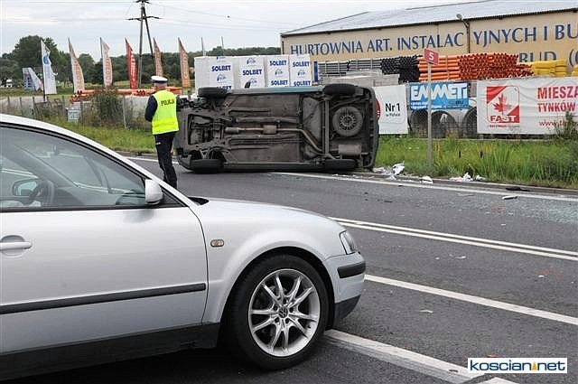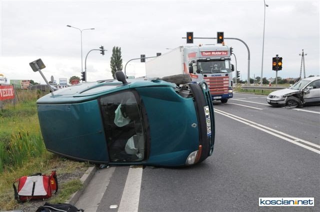 Do kolizji doszło przed godziną trzynastą na skrzyżowaniu z działającą sygnalizacją świetlną . Jadący od strony Leszna renault uderzył w skręcającego do miasta passata. Po zderzeniu renault przewrócił się na bok. Obaj kierowcy wyszli ze zdarzenia bez szwanku.