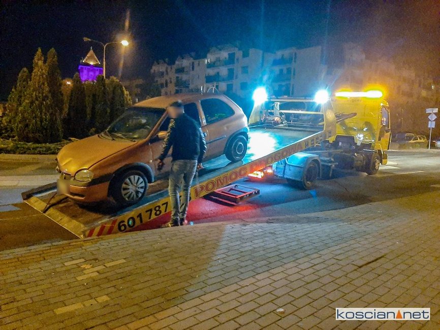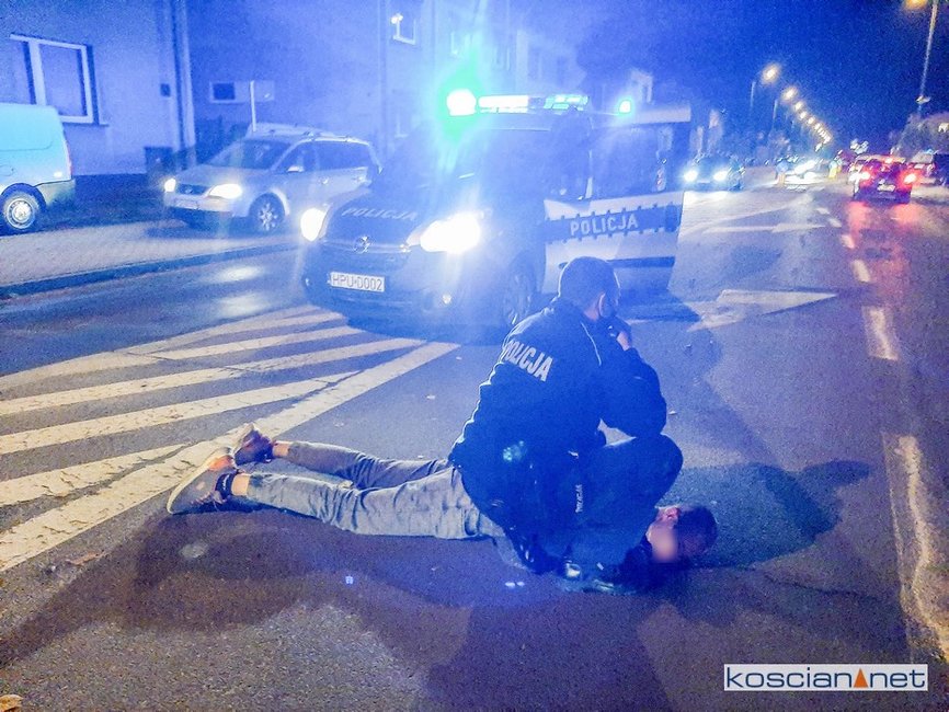 Taki był finał ucieczki, która rozpoczęła się na ulicy Mickiewicza w Kościanie, po tym jak do rutynowej kontroli nie zatrzymał się 28-letni kierowca opla. Policjanci ruszyli w pościg za kierowcą, który łamiąc przepisy ruchu drogowego i ignorując polecenia policjantów, przez ulice Surzyńskiego, Łąkową i Północną dojechał do skrzyżowania z ulicą Poznańską. Tam wjechał na rondo „pod prąd” a następnie doprowadził do czołowego zderzenia z volkswagenem. Po rozbiciu auta próbował uciekać pieszo. Został jednak zatrzymany.