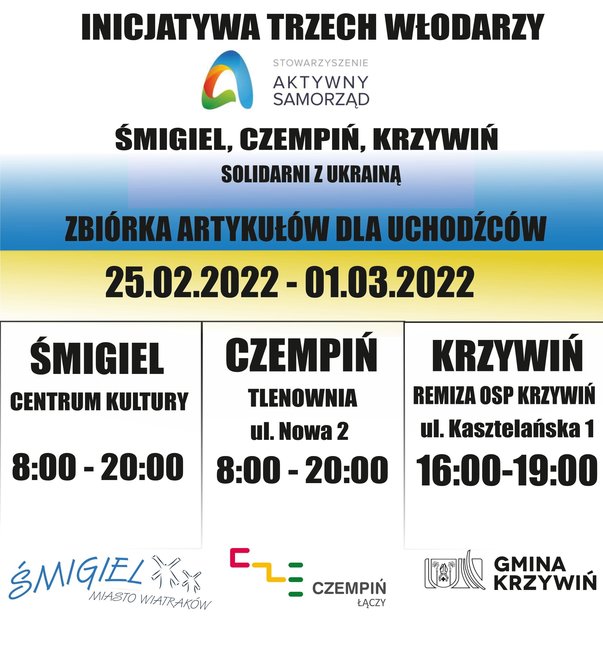 Burmistrzowie Czempinia, Krzywinia i Śmigla organizują zbiórkę artykułów dla uchodźców z Ukrainy. Dary można przynosić do 1 marca włacznie do czempińskiej Tlenowni, remizy OSP w Krzywiniu i Centrum Kultury w Śmiglu.