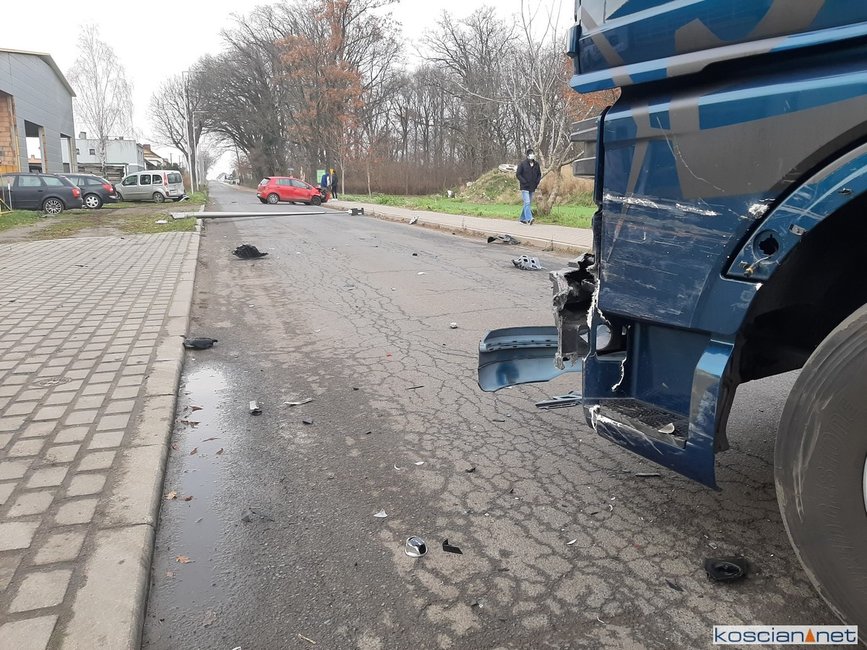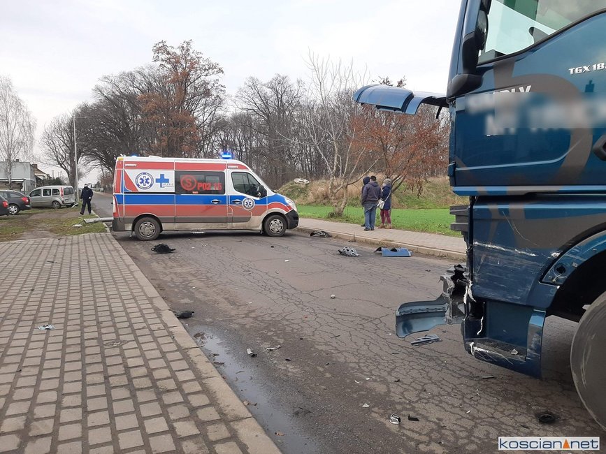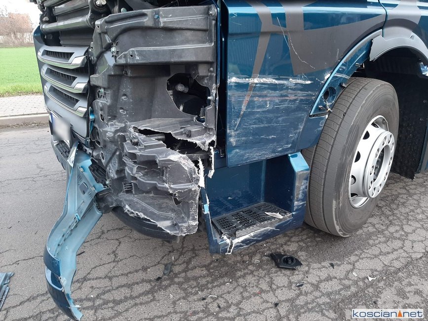 Do zdarzenia doszło w poniedziałek, 7 grudnia, około godziny 12. na ul. Południowej w Kurowie. Kierujący ciągnikiem siodłowym skręcając w lewo, na jedną z posesji, zderzył się z wyprzedzającą go toyotą, kierowaną przez 19-latkę z gminy Kościan. Po zderzeniu osobówka przemieściła się i uderzyła w przydrożną latarnię i zaparkowanego renaulta. Nastolatkę przewieziono do szpitala na badania. Okoliczności i przebieg zdarzenia ustala policja.