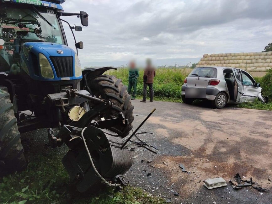Kierująco toyotą, chcąc uniknąć zderzenia z samochodem osobowym, ostro zahamowała czego skutkiem było czołowe zderzenie z ciągnikiem rolniczym.