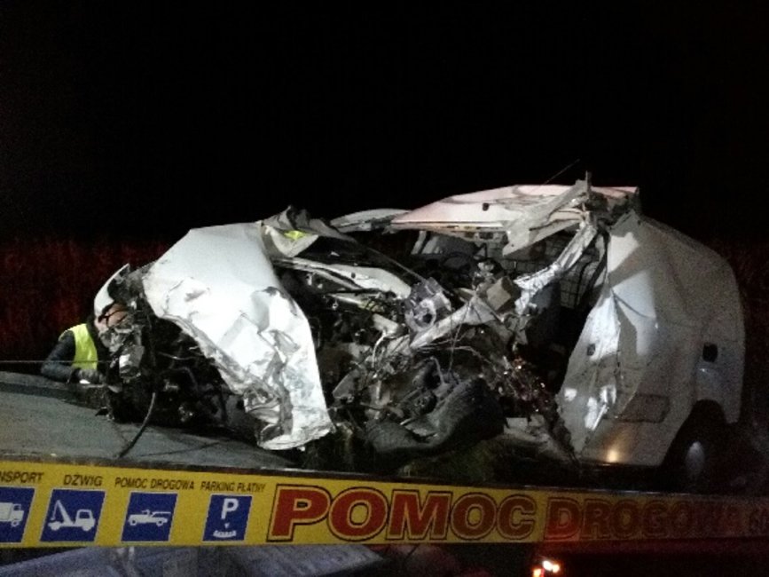 Do wypadku doszło w sobotę około godziny 18.15. Jak wynika z pierwszych ustaleń, kierujący dostawczym peugeotem partnerem zjechał na przeciwległy pas ruchu i zderzył się czołowo z samochodem ciężarowym marki DAF.