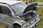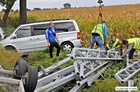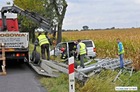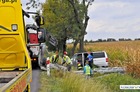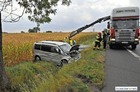 Mercedes z lawetą zjechał z krajowej „piątki” i zakończył jazdę w przydrożnym rowie.
