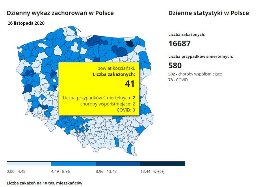 Dane dla powiatów nie obejmują liczby zakażonych od początku epidemii, liczby aktywnych przypadków, liczby ozdrowieńców i liczby osób hospitalizowanych.