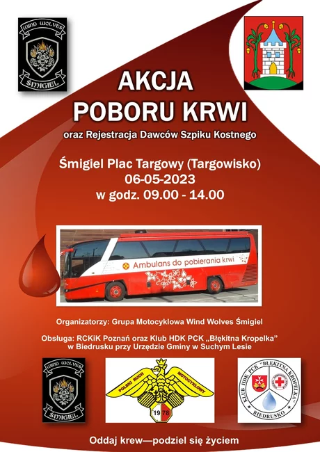 DZIEŃ WCZEŚNIEJ (sobota) na śmigielskim targowisku już w godzinach 9:00-14:00 na chętnych, by oddać krew lub zarejestrować się jako dawcy szpiku kostnego czekać będą dwa krwiobusy, które obsługiwać będą RCKiK Poznań oraz Klub HDK PCK „Błękitna Kropelka” w Biedrusku.