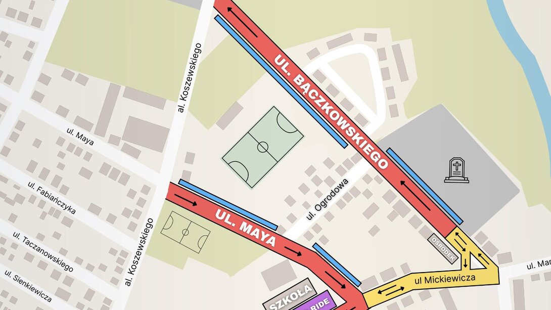 Najważniejsza modyfikacja dotyczy ulicy Bączkowskiego, która od teraz będzie jednokierunkowa. Parkowanie będzie możliwe po stronie cmentarza – tak, by wysiadający mogli bezpiecznie znaleźć się na chodniku.