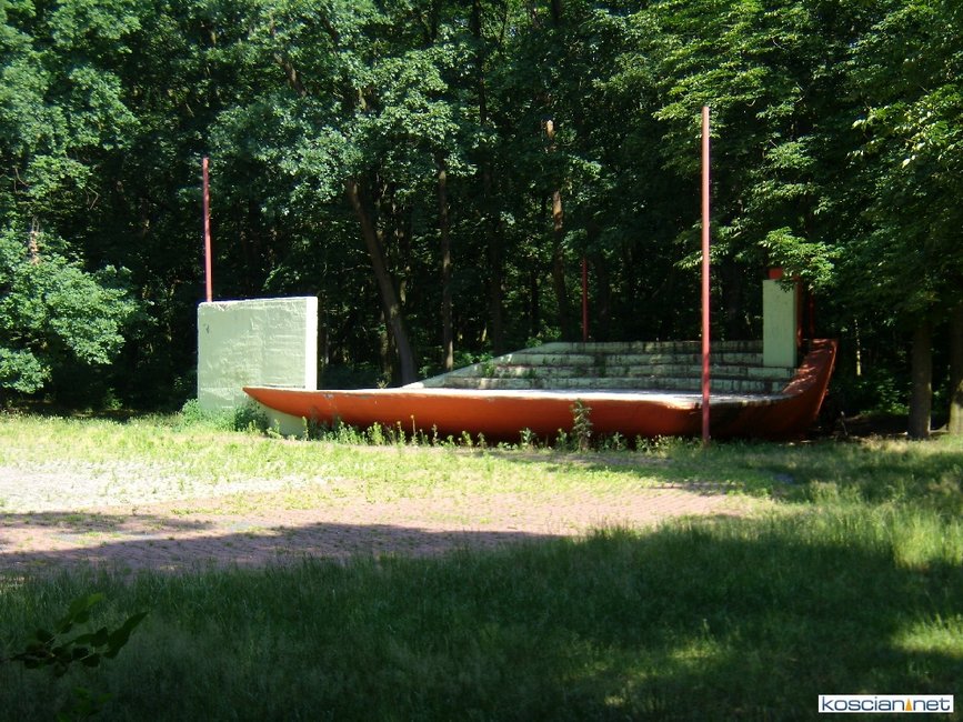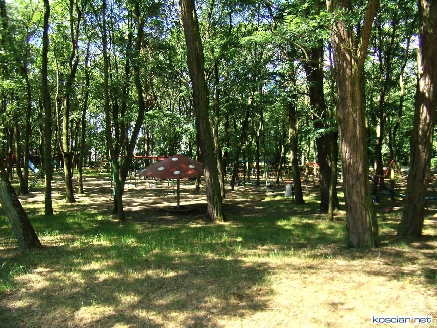 - park przed rewitalizacją, a w nim starty grzybek, ścieżkę zdrowia, muszlę koncertową i budynek dyskoteki Gotham,