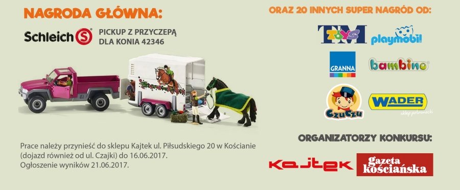 W aktualnym wydaniu Gazety Kościańskiej, na stronie 19, znajdziecie kolorowankę. Aby wziąć udział w losowaniu nagród należy pokolorowany rysunek przynieść do sklepu KAJTEK. Główna nagroda jest zabawka pickup z przyczepą dla konia. Ponadto czeka na Was 20 innych super nagród!
