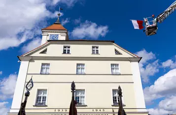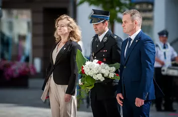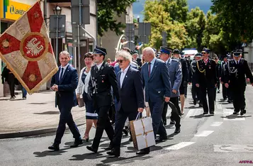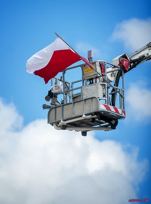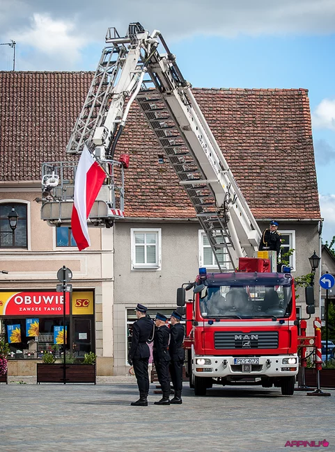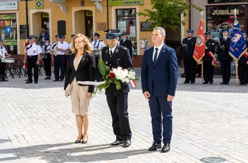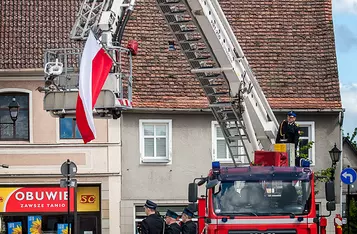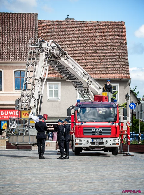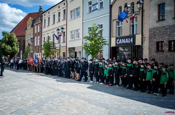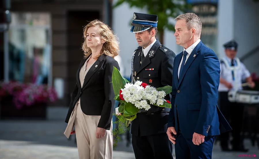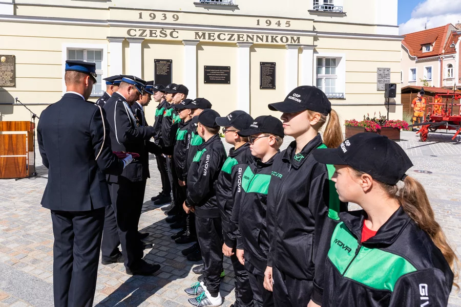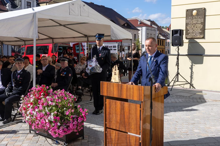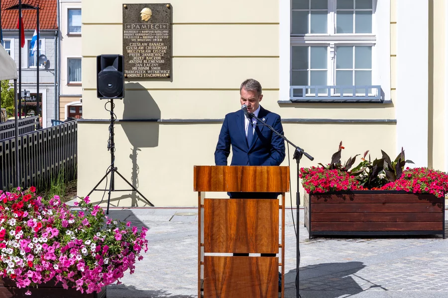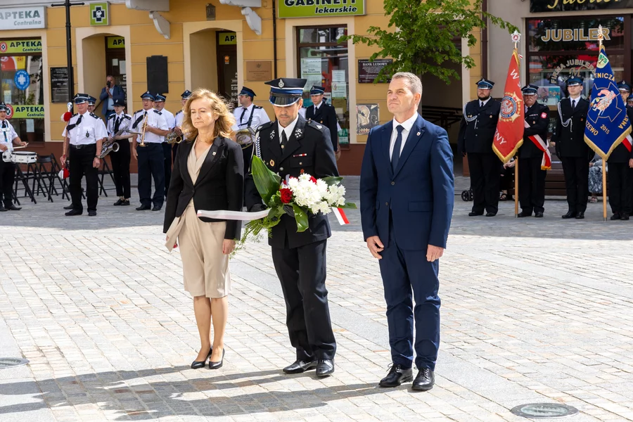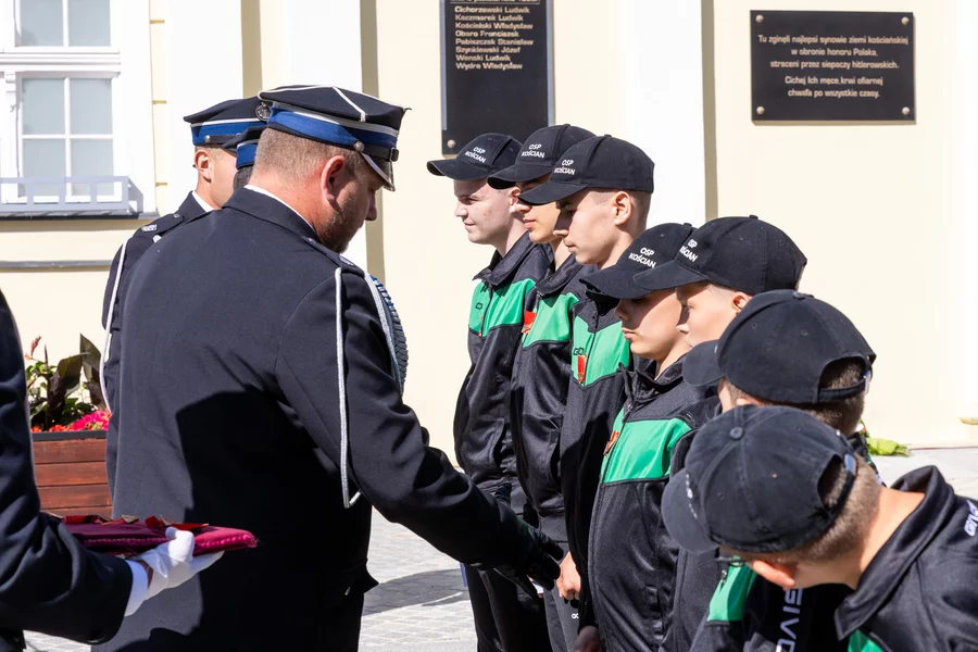 Po wciągnięciu flagi na strażacką drabinę, prezes OSP Kościan Hubert Bartkowiak, burmistrz Sławomir Kaczmarek i przewodnicząca Rady Miejskiej Kościana Tamara Turek złożyli wiązankę kwiatów przy tablicach upamiętniających kościaniaków poległych podczas II wojny światowej.