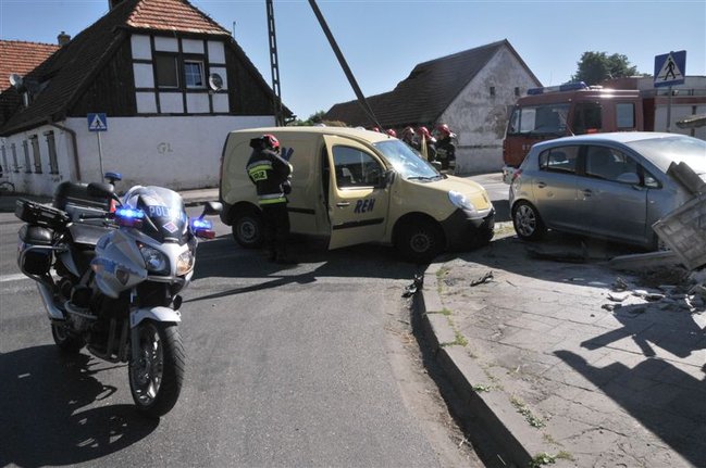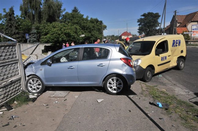 Jadący od strony Gryżyny 51-letni kierowca renault kangoo nie zastosował się do nakazu zatrzymania i wjechał na drogę wojewódzką 308 wprost pod opla corsę prowadzonego przez 34-latka. Corsa zakończyła jazdę uderzając w betonowy płot. Obaj kierowcy zostali przewiezieni do kościańskiego szpitala. Policja ustala okoliczności zdarzenia.